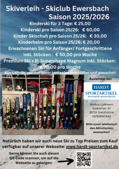 Unser Mitglied und Trainerkraft Markus Lohmann betreibt die Firma Hardt Sportartikel und hat einen Fundus an alpinen Ski und Schuh, aber auch an nordischer Langlaufausrüstung zum Verleih oder auch zum Kauf.